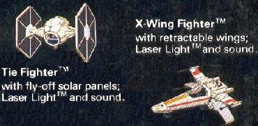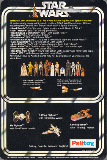 The reverse of the 12-back card was modified from the original 12A cardback when it became apparent that part of the text on the card wasn't relevant to some of the UK toys. The change concerned the description of the vehicles shown at the bottom of the card. The UK version of the X-wing fighter toy did not have electronic light and sound as stated on the cardback. This was a feature of the US version of this toy. The text 'laser light and sound' was removed to correct this. The same text was also removed from the description of the Tie fighter toy, most likely as it was not intended to have electronics either. I have not seen a Palitoy boxed Tie Fighter to confirm whether it had the light and sound, it is more common to find Kenner boxed Tie Fighters (with a Palitoy sticker) in this country, which do have the feature. | ||