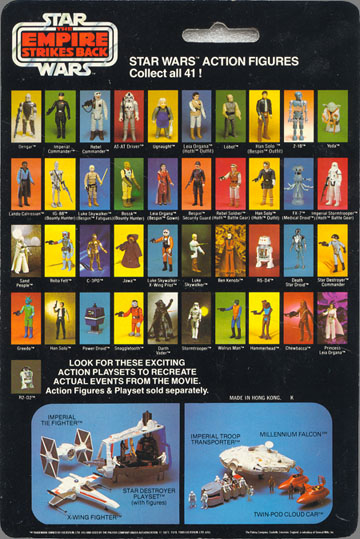 The 41b card was similar in design to the previous 41A card, but the bottom of the cardback shows a different set of vehicles. There is a version of this card that can be found with a small plain blue sticker covering some of the text of the vehicle descriptions. This is because the Star Destroyer playset was described as being 'with figures', yet this set did not include any when sold in the UK. | ||