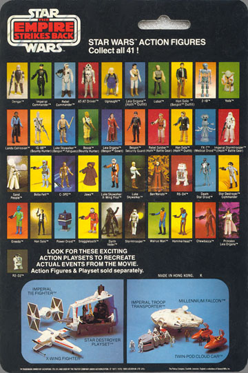 The 41C card is almost identical to the 41B card. There is a very small but significant difference amongst the wording on the rear of the card. The difference is in the text describing the Star Destroyer playset shown at the bottom of the cardback. On the earlier 41B version this item was incorrectly described as coming 'with figures'. This part of the text has been removed on the 41C card. The modified cards seem less common than the original, I have seen very few figures with this variation. | ||