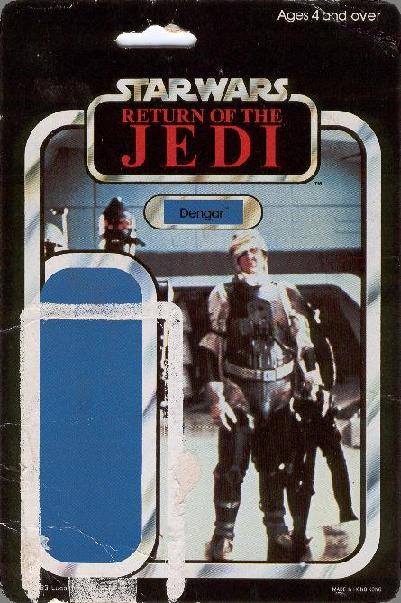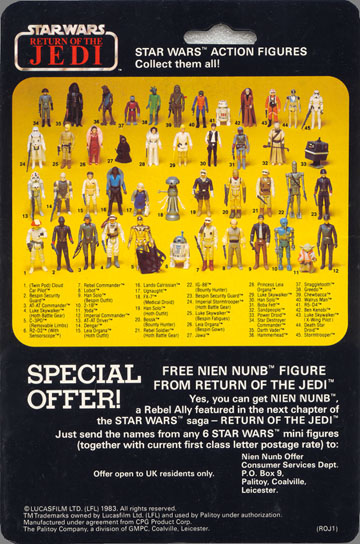 The 45c card was produced to tie in with the third Star Wars film released in 1983. It is likely the card was designed some time before the film release, as it bears no pictures of the new figures released for Jedi. The card in fact only shows forty-five figures, and the last three of the Empire Strikes back series (4-Lom, Zuccuss, Tie Fighter Pilot) are not pictured, despite the fact these figures appeared on this cardback. The figure picture on the rear is in fact exactly the same picture as on the Empire 45-backs. It appears that only figures from the Empire Strikes Back and Star Wars films appear on this cardback, none of the ROTJ series were available until the appearance of the 65-back series of cards. In the bottom right corner of the card back are the letters '(ROJ/1)' signifying this was the first Jedi card released. | ||