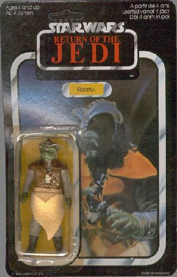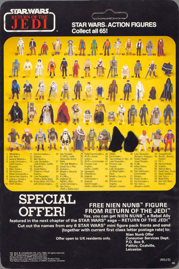 The 65A card appeared with the release of the first seventeen figures from the film Return of the Jedi. The card features the film logo at the top of the card with a black border area beneath, similar to the 45B Empire Stikes Back cards. The 'ages 4 and up' warning on the card front is displayed in five languages (English, German, French, Dutch/Flemish? and Italian), indicating that these cards were intended to have a wide distribution through mainland Europe as well as in the UK. This feature may have been a pre-cursor to the 77-Back 'Tri-logo' cards which featured the film logo in three languages. The front of the card also has no manufacturer's logo, unlike the equivalent Kenner card and earlier Palitoy releases. The rear of the card shows the range of figures available, which has now increased to 65. The cardback also features the mail-away offer for the Nien Nunb figure already seen on the 45C cardback. The text of this offer has been adjusted and moved further down the body of the card in order to make room for the extra 20 figures shown above. The figure featured in this offer has not (yet) been seen on this cardback, and may not have been released. All of the other first released Jedi figures were available. None of the earlier Star Wars or Empire Strikes Back figures were released on this cardback, these had their own variant of the ROTJ packaging, the 45C and 65D cards. The bottom right of the cardback has the text '(ROJ2)', a logical follow up to the equivalent text on the 45C card which states '(ROJ1)'. All 65A cards appear to be factory punched. A similar card to the 65A is the 65B, which has a different copyright statement in the bottom left corner, but is otherwise identical. | ||
