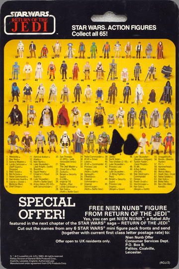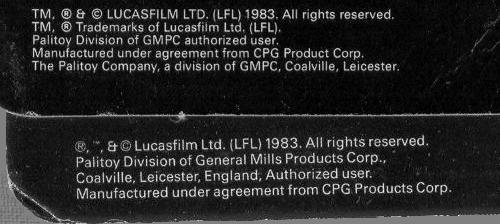 The 65B card is almost identical to the 65A card, but with a few subtle differences. The front of the card looks identical to the 65A, with the film logo high on the card with a black border beneath and the age warning in five languages. The significant difference appears on the rear of the card, where the trademark/manufacturers text has been changed. The new text is written in a larger font, and is reduced to four lines in length rather then five as before. It is assumed that the 65B appeared after the 65A as this reduced copyright text matches that on the 65C cards, which did come later. A lot of the 65B cards appear to have been factory punched. This is another difference from the 65A, which tended not to be punched. A large number of them also seem to have the larger 'tri-logo' style bubbles, or the two-pronged bubble often found on 45-backs. | ||