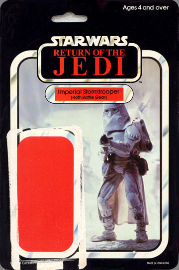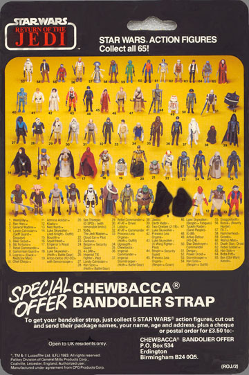 The 65D card has the same front as the first Jedi release, the 45C card, which makes it quite different from the other 65-back cards. The most noticeable difference is that the age warning in the top right corner is in English only, rather than in five languages like the 65A,B and C cards. The Return of the Jedi logo also sits lower on the front of the card, so there is no black border beneath this. The back of the card is identical to that of the 65c card, featuring the mail away offer for the Chewbacca Bandolier figure holder. Like the 65c card, this card can be found with the closing date for the bandolier offer blacked out (the cardback above is one such example). The only figures seen on this card are from the Star Wars and Empire Strikes Back films, the Return of the Jedi series of figures could only be found on 65A, B and C cards. | ||