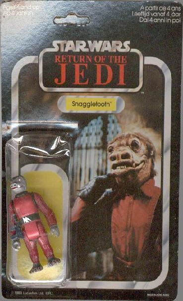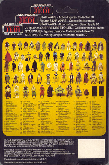 The 70A back card seems to have been a transition between the original Return of the Jedi 65-back series of cards and the later 70-back 'Tri-logo' card (defined as a '70B' or '70C' card on this site). The card has the same front as the 65-back cards, with the age warning in three languages. The rear of the card has the film title logo in three languages at the top left of the cardback, identical to the 'Tri-logo' card. The back of the card states 'collect all 70 but curiously the figures are numbered from 1 to 79. If you look closely there are several gaps in the numbering, and indeed only seventy figures are represented. Missing are the Cantina Aliens, Power Droid, Bespin Guards and Cloud Car Pilot. There were only ever a few figures available on the 70As card variation, these being three of the Cantina aliens (Snaggletooth, Hammerhead and Greedo) plus both Bespin Guards and the Cloud Car Pilot figure. Interestingly, these are also the figures not shown on the cardback. | ||