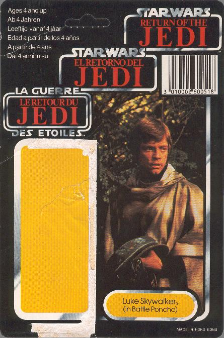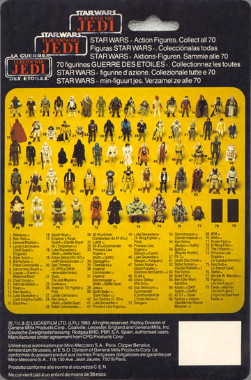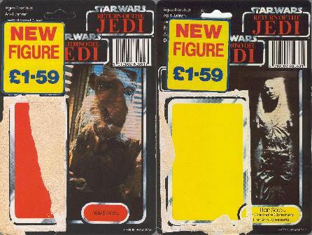 The 70D Cardback is similar in design to the two previous tri-logo cards, the 70B & C, but has the addition of a barcode on the front of the card. This barcode is located at the top right of the card beneath the ROTJ logo. The Lucasfilm copyright statement has also disappeared from the bottom left corner. The rear of the card is identical to the other 70-back cards, curiously this was not updated to show the new range of figures. Only the final release of 15 figures appeared on this particular cardback. In the USA, these figures were only released on the newly-designed 'power of the force' cards, and are often referred to as the 'power of the force' series of figures. Power of the force cards are not believed to have appeared at retail in the UK. All the 70D cards I have seen have Hong Kong as the stated country of manufacture on the card front. None appear to have the Lucasfilm copyright text in the bottom left corner. Neither do any appear to have been factory punched. |